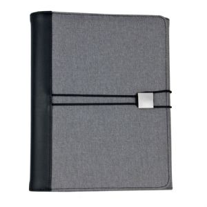 Description Manufactured from on-trend grey Polyester and contrasted with black PU and Nylon materials this tri-fold compendium is the ultimate business companion for the modern executive. It is supplied with a 100 page spiral pad, has an exterior badge that can be laser engraved and elastic closure. An additional internal zippered pocket is perfect to hold your valuable and there is plenty of room for business cards and a penloop.