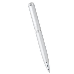 Matt silver finish with shiny silver accents and twist action mechanism. Supplied with black ink.