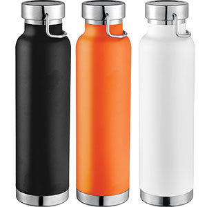 The construction also prevents condensation on the outside of the bottle. On-trend, durable powder coating. Stainless steel screw-on, spill resistant lid with durable stainless steel hand loop. Wide opening for comfortable filling and pouring. Perfect for ice cubes. Fits most standard car cup holders. 650ml capacity.
