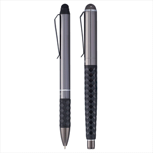 Aluminium stylus twist action ballpoint pen. Aluminium roller ball pen with removable cap. Edgy geometric detailing. Sleek graphite barrels.