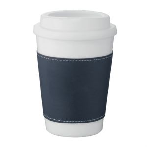 White double-walled tumbler with removable vinyl sleeve. It is perfect to provide insulation from hot drinks.
