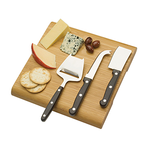This laminated cheese board is made from bamboo and comes with three stainless steel cheese slicing utensils. Packaged in a two part gift box.