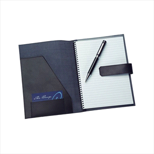 Features inside pocket, business card holder and lined spiral pad which inserts from the side. Pen not included.