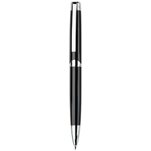 Twist action metal ball point pen in black with shiny silver accents. Supplied with Black ink