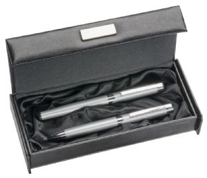 Black double pen box with shiny silver metal badge