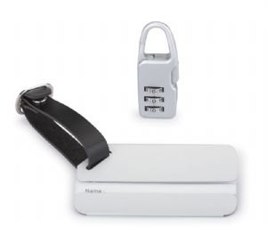 Exclusive set with matt silver coloured luggage lock and aluminium luggage tag with black tie.