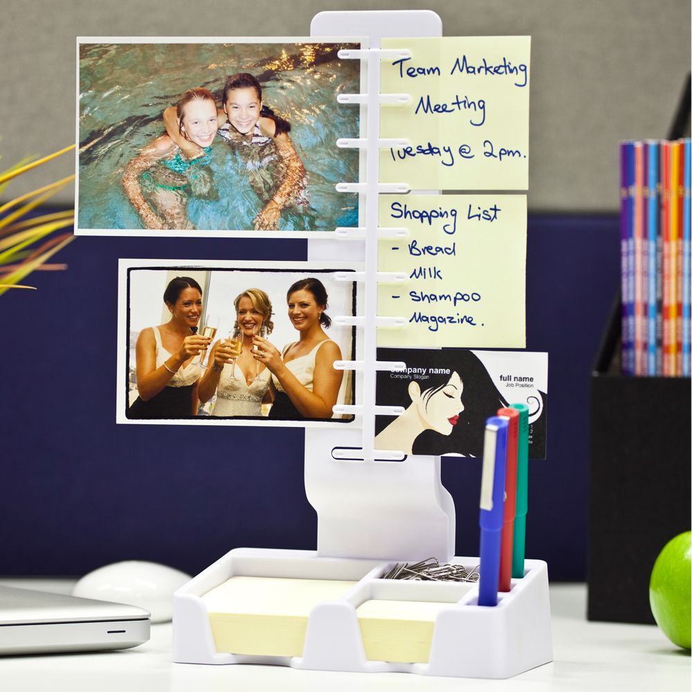Includes space for 2 sizes of sticky notes (included), paper clips (not included) and pens (not included).