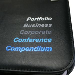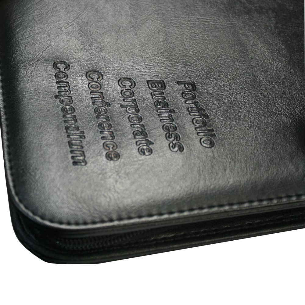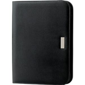 Stylish A4 compendium with solar calculator. Zippered closure. Includes refillable 30 page writing notepad. Front open document pocket. Internal expanding pocket, zippered pocket and pen loop. Pen not included.