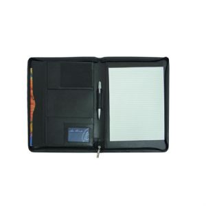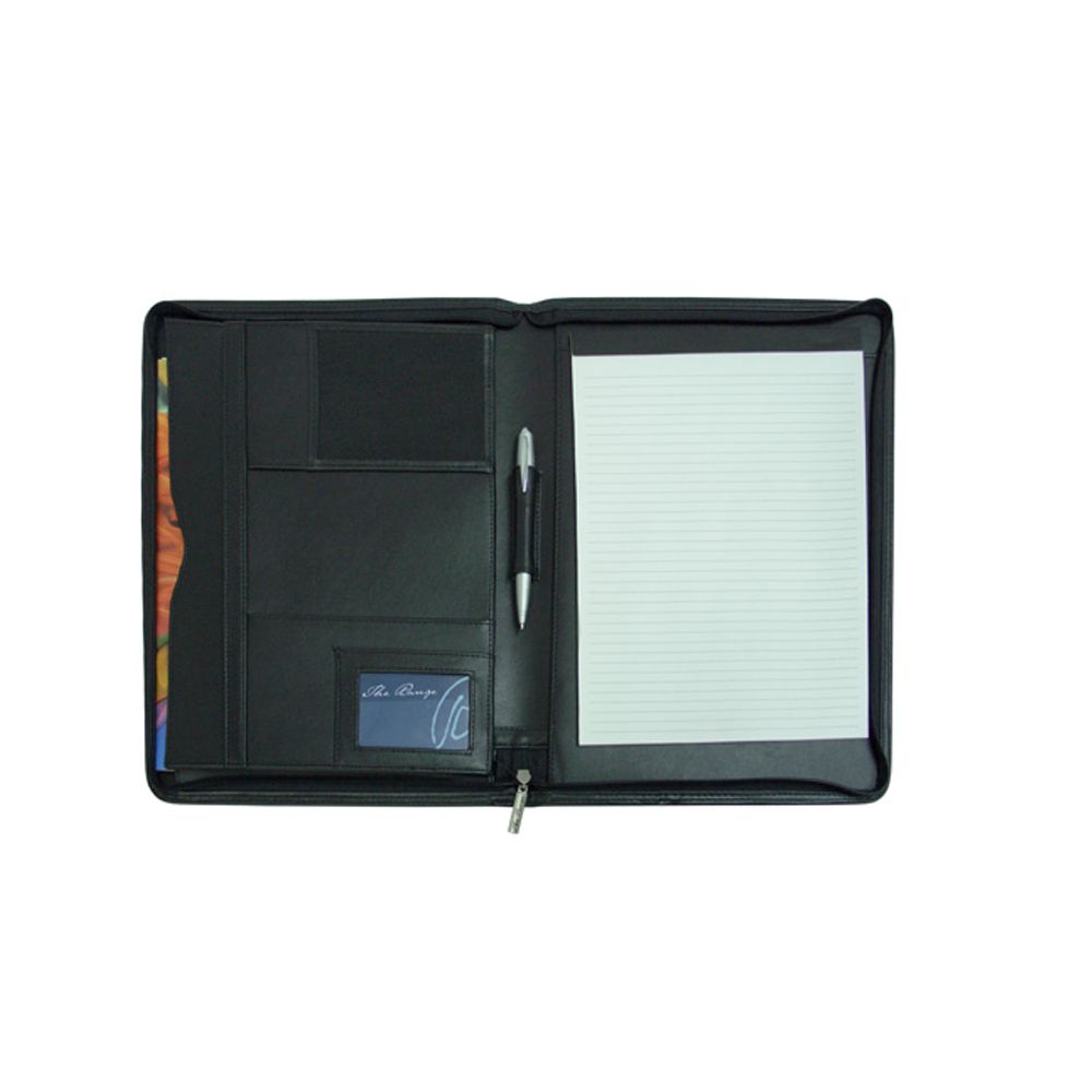 Features include zipper closure, pen loop, business card holders, 2 internal gusseted pockets and A4 lined pad which inserts from the top. Pen not included. Check out our Tablet Compatibility chart to see which tablets fit in the product.