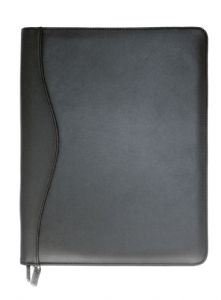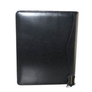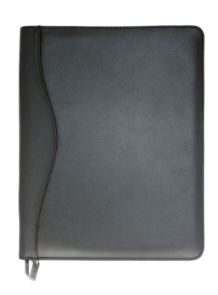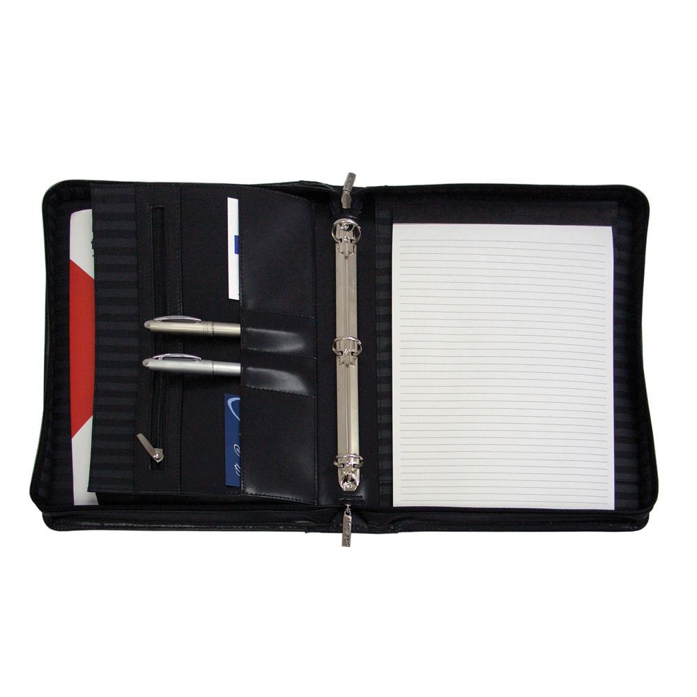 Features include zipper closure, fixed 3-ring binder, 2 internal gusseted pockets, internal zippered pocket, 2 pen loops, business card holders and A4 lined pad which inserts from the top. Pens not included. Ring size: 26mm Diam. Fits an iPad in the left side pocket.