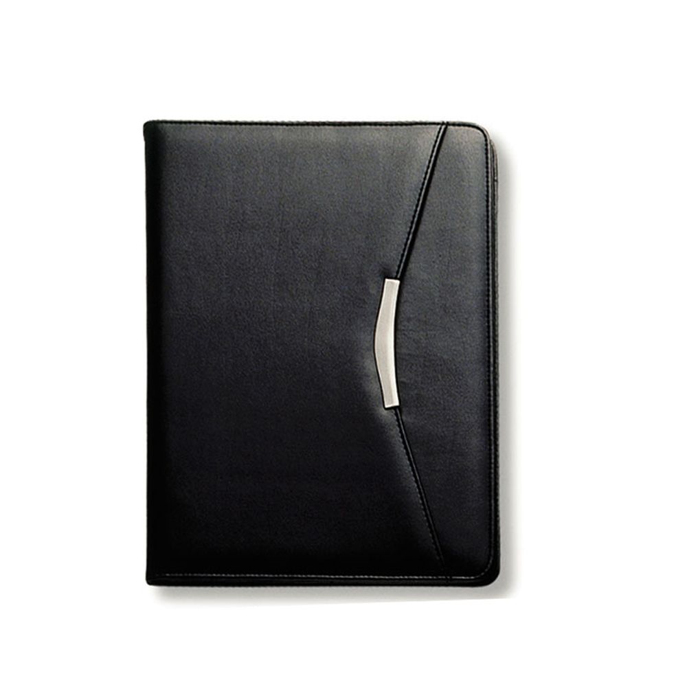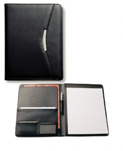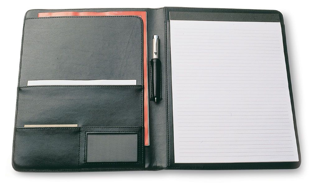 Features include pen loop, inside pocket, business card pockets and A4 lined pad which inserts from the top. Pen not included. Engraves silver