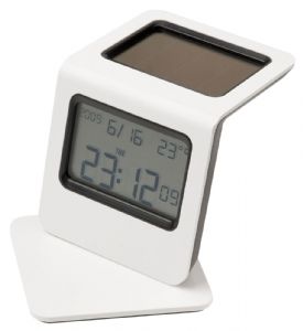Dual function solar powered desk clock environmentally friendly with a magnetic base. |