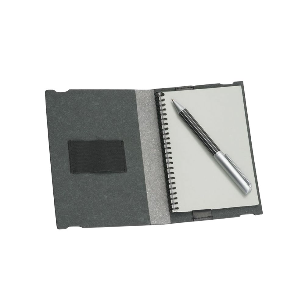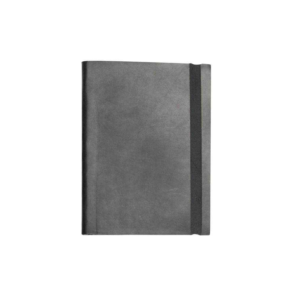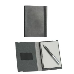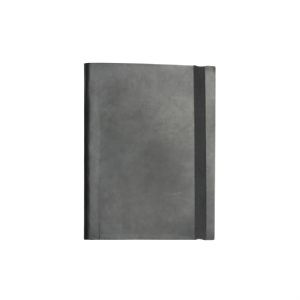 Made from bonded leather with elastic closure and pen loop. |