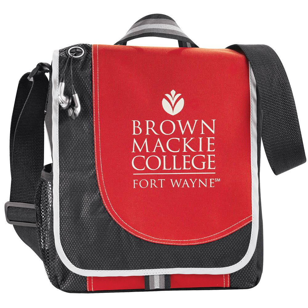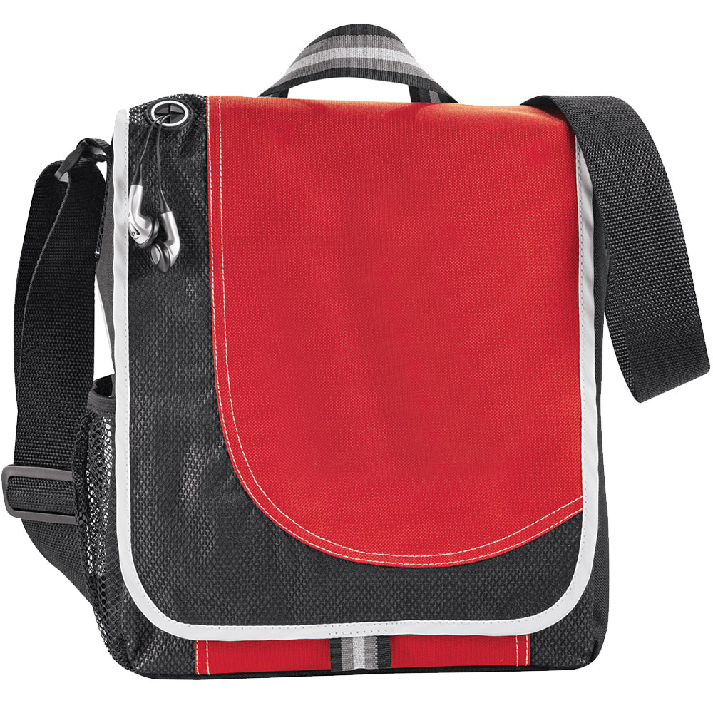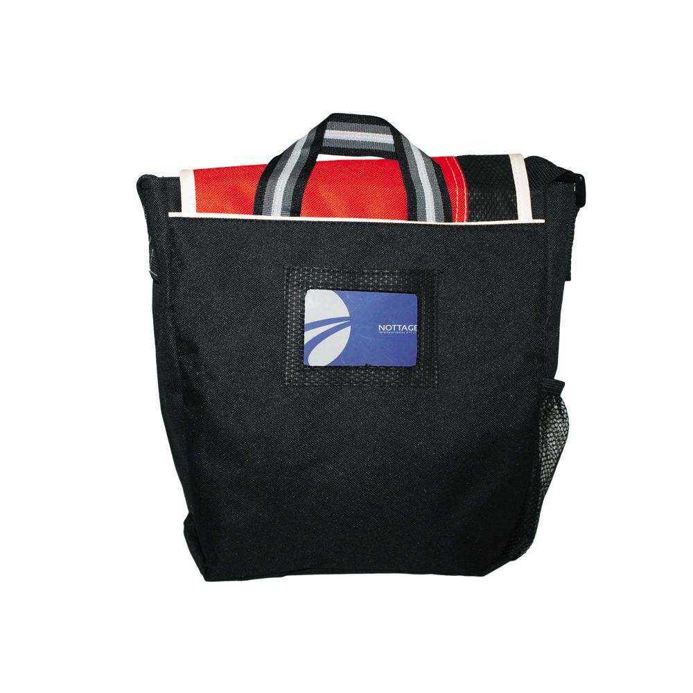Made from 600D Polyester. Features an open main compartment, media pocket under flap with access to earbud port, side mesh pocket and pen loop. Supplied with business card stitched on bag. Available in 2 colours. |