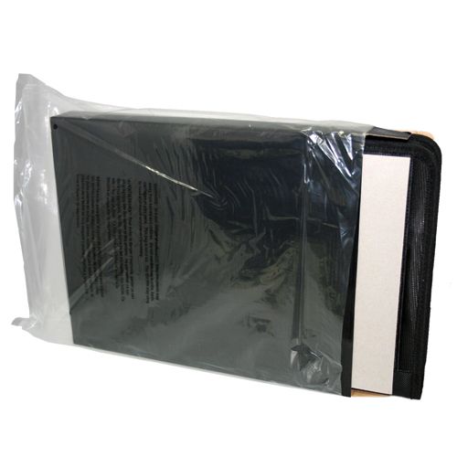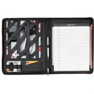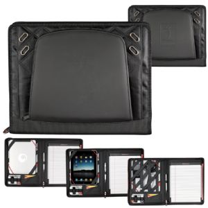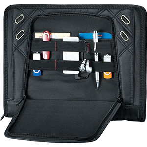 Zippered closure. Tech Trap elastic interior organizer. Holds an iPad. Front cover access pocket with business card holders and media organizers. (Pens, iPad and other devices shown are not included)