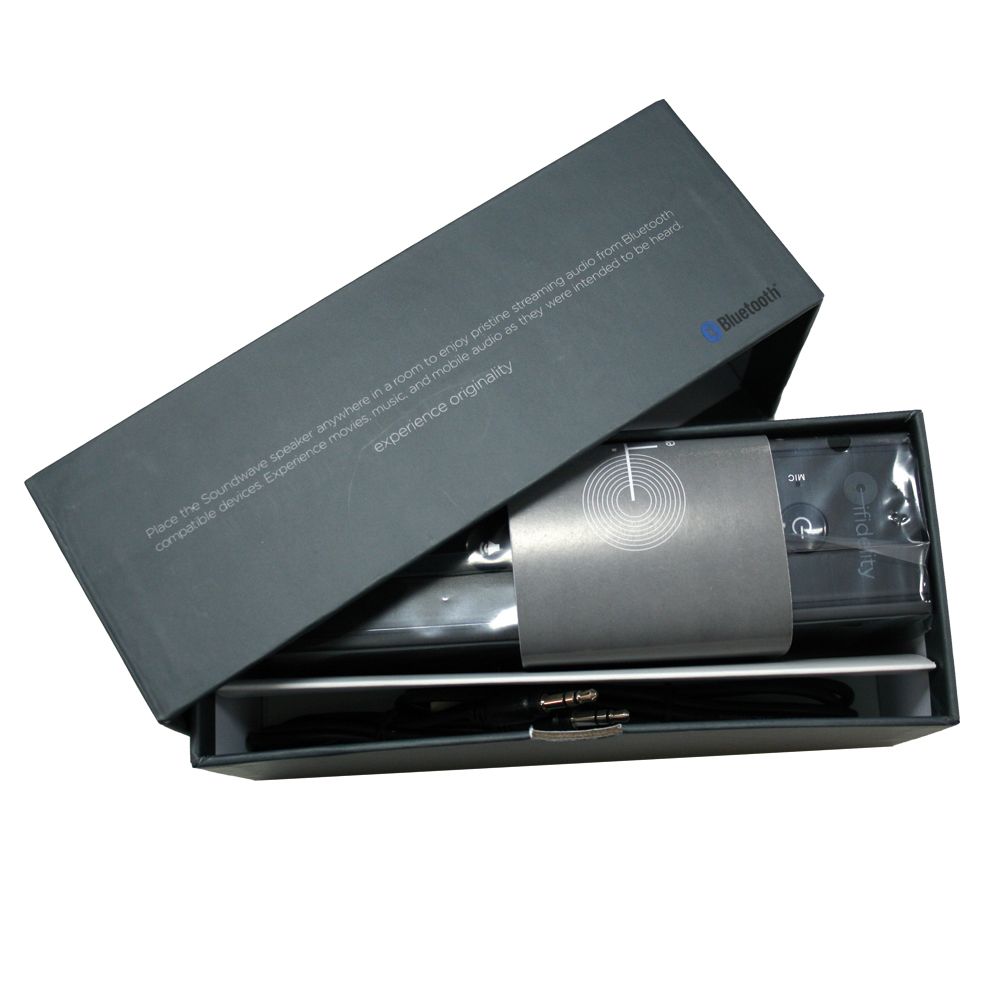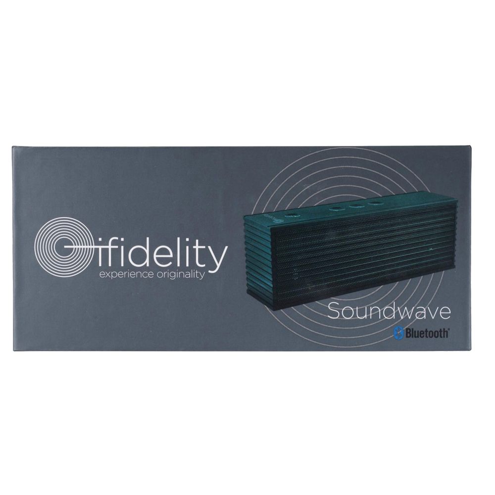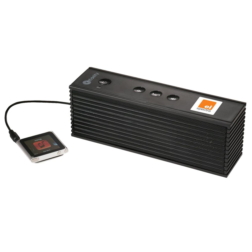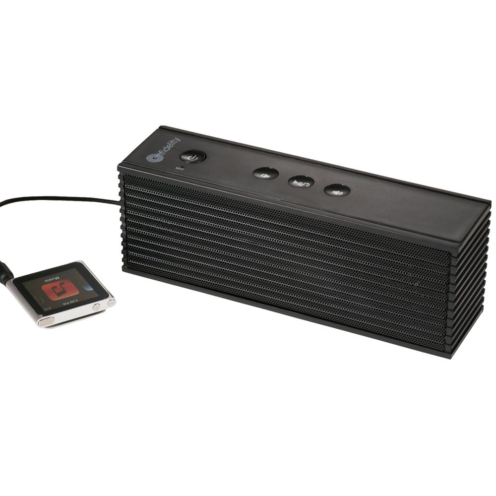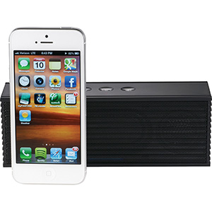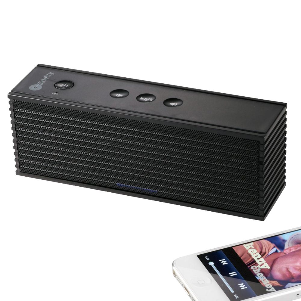 Modern styled bluetooth speaker with mobile answering system that pauses your music and allows you to answer a call with hands free technology. Charges via USB cable. Includes AUX cable. Built in lithium battery. Supplied in ifidelity gift box.