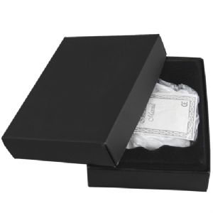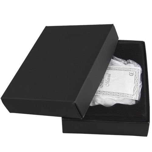Wrapped in tissue paper in a polybag sitting in a black moulded insert and presented in a plain black 2 part gift box. Packaging Size: 120mm(h) x 150mm(w) x 38mm(d)